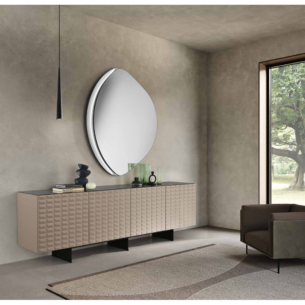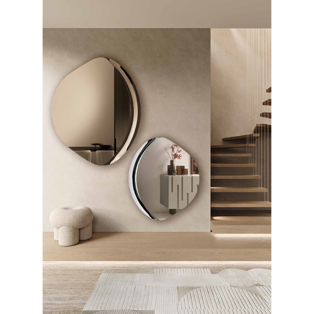 The Acai mirror is a high-impact decorative piece defined by a unique semi-frame in tone-on-tone fused glass. Available in natural or bronze finishes and three different sizes, this Italian-designed mirror adds materiality, brightness, and a touch of sculptural elegance to any space, from the entrance to the living area.