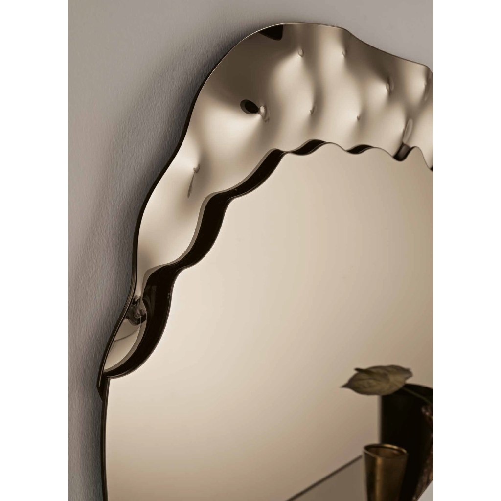 The Fuji mirror represents the peak of modern glass artistry, introducing a new level of depth to interior styling. Its core concept revolves around the interaction of different textures: the flawless clarity of the mirror meets the organic, rhythmic motion of handcrafted cast glass. This interplay creates a dynamic visual experience that changes with the lighting, ensuring that Fuji remains the focal point of any interior setting. The base consists of a tone-on-tone wavy crystal (cast glass), placed on one side, acting as the foundation on which the main mirror appears to "rest."