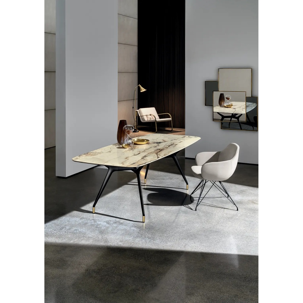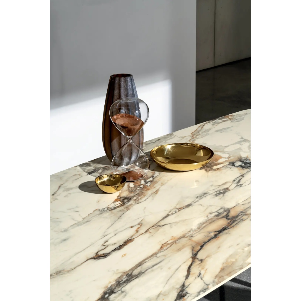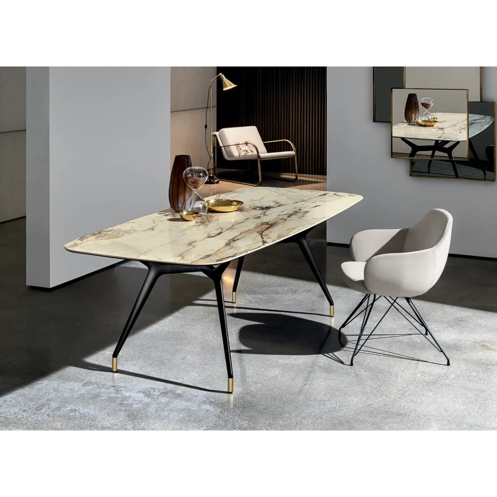 The ARKOS Oval Shaped 01 Dining Table represents the pinnacle of Italian design by Sovet Italia. The unique oval shaped form (Shaped 01) of the top, with its soft, curved lines, offers an aesthetic harmony reminiscent of the '50s, while seamlessly integrating into the contemporary modern dining room. It is specifically designed to impress in large spaces, acting as a true functional sculpture. Design & Dimensions: The Shaped 01 top is the widest in the collection, reaching 135cm in width, ideal for comfortably accommodating many guests. It is available in fixed sizes: 220x115x75h, 250x120x75h and 300x135x75h cm. Ceramic Top: The ceramic surface is available in 2 types of Ceramics (CE1 - CE2 ) in glossy and matt finishes as: Ceramica travertino stone beige, Ceramica Breccia Reale, Ceramica Calacatta prelucidata, Ceramica Black Gold, the impressive Ceramica Antique and many others, offering variety in look and texture. IMPORTANT CLARIFICATION: Due to the complexity of the oval shaped form in the large dimensions, not all material options are available in all sizes. Please contact us to confirm your desired configuration. Dimensions: