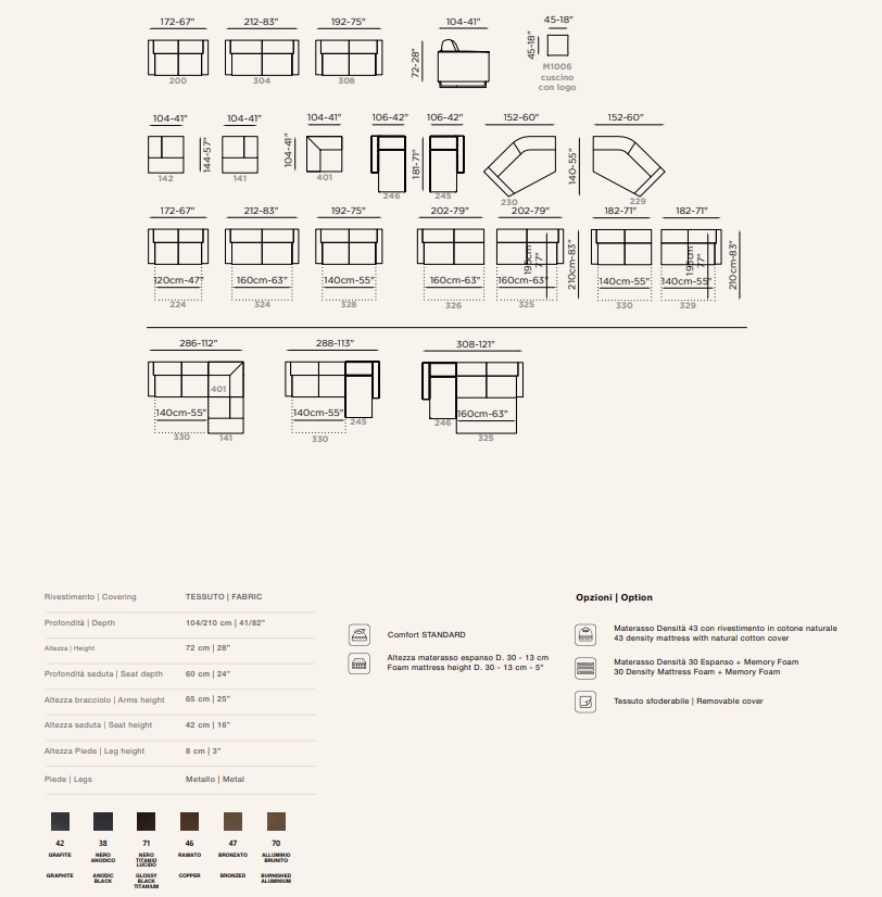 Franco Ferri offers a wide range of options to tailor the Costa to your specific needs. You can choose from different mattress qualities, such as Memory Foam or a high-density mattress with a natural cotton cover. Furthermore, the metal legs are available in various finishes (such as Black, Graphite, Bronze, Glossy Titanium), allowing you to create a unique combination that will harmonize perfectly with the rest of your home decor.