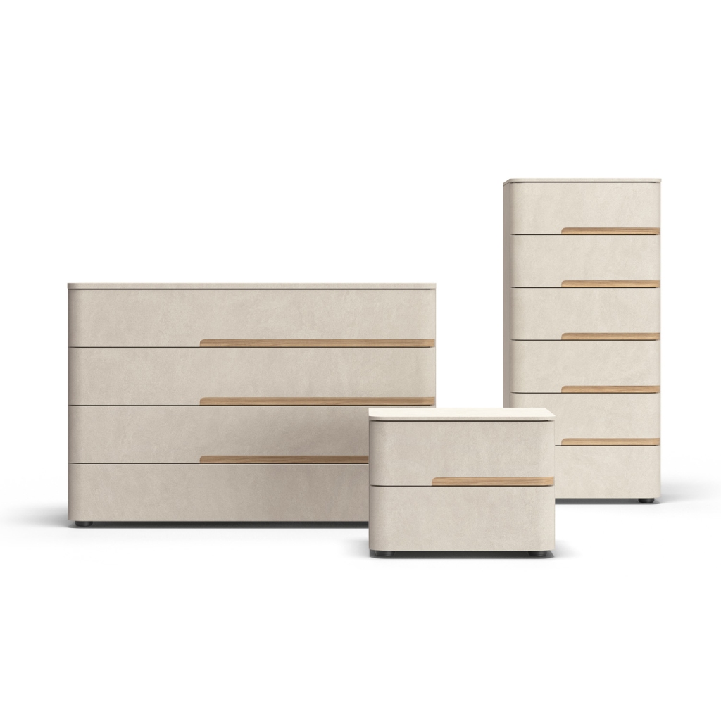 Κομοδίνο Opale: Η Γοητεία του Μαλακού Σχεδιασμού (Soft Design)Το Κομοδίνο Opale φέρνει έναν αέρα σύγχρονης κομψότητας στην κρεβατοκάμαρα, εστιάζοντας σε μαλακές και στρογγυλεμένες γραμμές. Αυτή η απαλή σχεδίαση δημιουργεί έναν ελκυστικό και φιλόξενο χώρο, απομακρυνόμενο από τις αυστηρές, γεωμετρικές φόρμες. Η μπροστινή όψη των συρταριών είναι στρογγυλεμένη και κοσμείται από μια διακοσμητική λεπτομέρεια που λειτουργεί ως πρακτικό πλευρικό άνοιγμα/χερούλι (lateral grip). Το κομοδίνο στηρίζεται σε ένα ρυθμιζόμενο μαύρο πλαστικό ποδαράκι ύψους 2.3 εκ., το οποίο ανασηκώνει διακριτικά το έπιπλο, προσδίδοντας ανάλαφρη αισθητική. Υλικά & Λειτουργικότητα Υψηλής ΠοιότηταςΗ κατασκευή του Opale δίνει έμφαση στην ποιότητα και τη λειτουργικότητα: