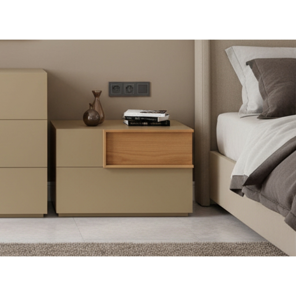 Κομοδίνο Solid: Minimal Design, Δύο Συρτάρια και η Ζεστασιά του Μασίφ ΞύλουΟ σχεδιασμός του Κομοδίνου Solid εστιάζει στην ισορροπία μεταξύ μοντέρνου minimal στυλ και διαχρονικής ζεστασιάς. Με ύψος μόλις 40 εκ., ενσωματώνεται αρμονικά δίπλα σε χαμηλά κρεβάτια και βάσεις, διατηρώντας καθαρές τις γραμμές του υπνοδωματίου. Η αισθητική του χαρακτηρίζεται από την καθαρότητα των σχημάτων του, επιτρέποντας στο έπιπλο να λειτουργεί ως μια ήρεμη βάση για τη διακόσμηση. Η κρίσιμη design λεπτομέρεια, που προσδίδει την υπογραφή Solid, είναι το πόμολο από μασίφ ξύλο. Αυτή η μικρή αλλά ουσιαστική προσθήκη δημιουργεί μια όμορφη αντίθεση υλικών, τονίζοντας τη φυσική, οργανική υφή του ξύλου απέναντι στην λεία επιφάνεια του σώματος του κομοδίνου (είτε είναι λάκα είτε καπλαμάς). Επιλογές & Διαστάσεις: Ευελιξία σε ΠλάτοςΤο Κομοδίνο Solid προσφέρει ευελιξία με δύο βασικές επιλογές πλάτους:
