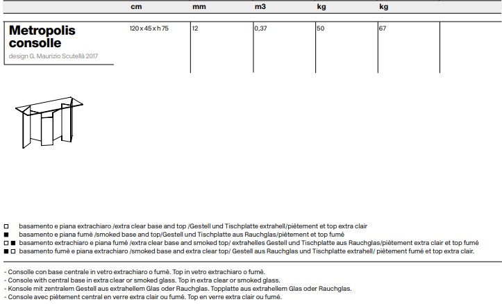 Η Κονσόλα Metropolis της Tonelli Design αποτελεί κορυφαίο δείγμα του ιταλικού design, φέροντας την υπογραφή του αρχιτέκτονα Giuseppe Scutellà. Η έκδοση All-Glass είναι αφιερωμένη στην τέχνη του γυαλιού, καθώς τόσο η βάση όσο και το καπάκι κατασκευάζονται εξ ολοκλήρου από κρύσταλλο (extra clear ή smoked). Η εντυπωσιακή γεωμετρική βάση προσδίδει στην κονσόλα μία οπτική ελαφρότητα και έναν αρχιτεκτονικό χαρακτήρα, κάνοντάς τη ιδανική για εισόδους και χώρους υποδοχής. Διατίθεται σε διάφορες διαστάσεις για να ταιριάξει στον χώρο σας, αποτελώντας ένα κομψό, ιταλικό έπιπλο Made in Italy.