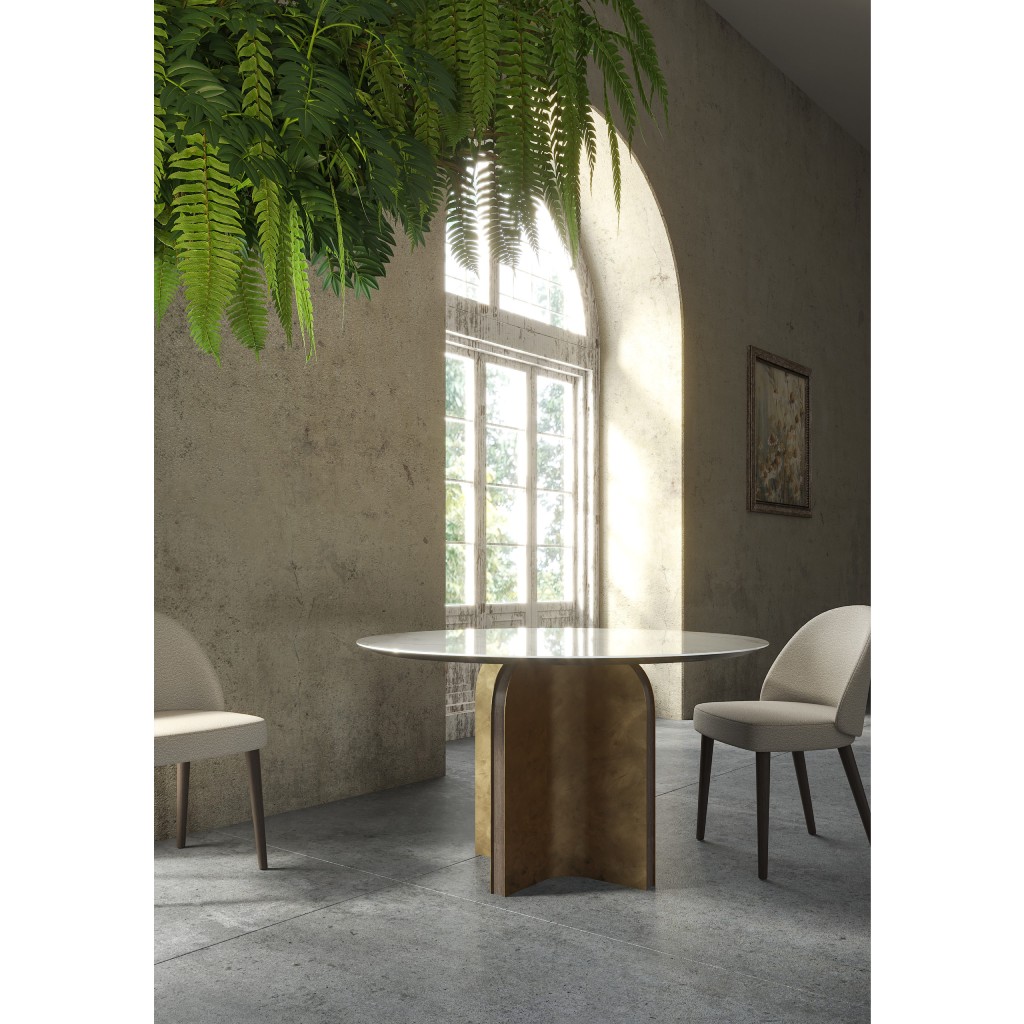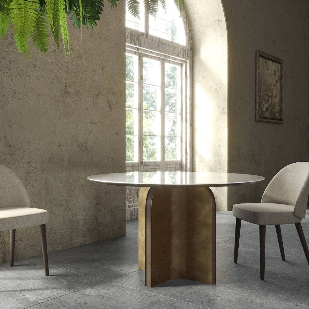 Σταθερό Στρογγυλό Τραπέζι Met: Ροτόντα με Κεραμικό & Μεταλλική Βάση Patina Το Τραπέζι Τραπεζαρίας Met ξεχωρίζει για τον αρμονικό συνδυασμό της στιβαρής μεταλλικής βάσης και των ζεστών ξύλινων λεπτομερειών (Δρυς, Καρυδιά, Καπνιστός Ευκάλυπτος). Πρόκειται για σταθερή ροτόντα, ιδανική για όσους αναζητούν ένα statement κομμάτι design. Υλικά & Φινιρίσματα: Το καπάκι είναι διαθέσιμο σε 14 ματ ή γυαλιστερές αποχρώσεις Κεραμικού ή σε ποιοτικό καπλαμά (Δρυς, Vintage Δρυς, Καρυδιά, Καπνιστός Ευκάλυπτος). Η μεταλλική βάση από μέταλλο με ηλεκτροστατική βαφή εξαιρετικής αντοχής, μπορεί να λάβει ειδικά φινιρίσματα όπως Bronze Patina ή Copper Patina. Διαστάσεις: Διατίθεται σε σταθερές διαμέτρους |